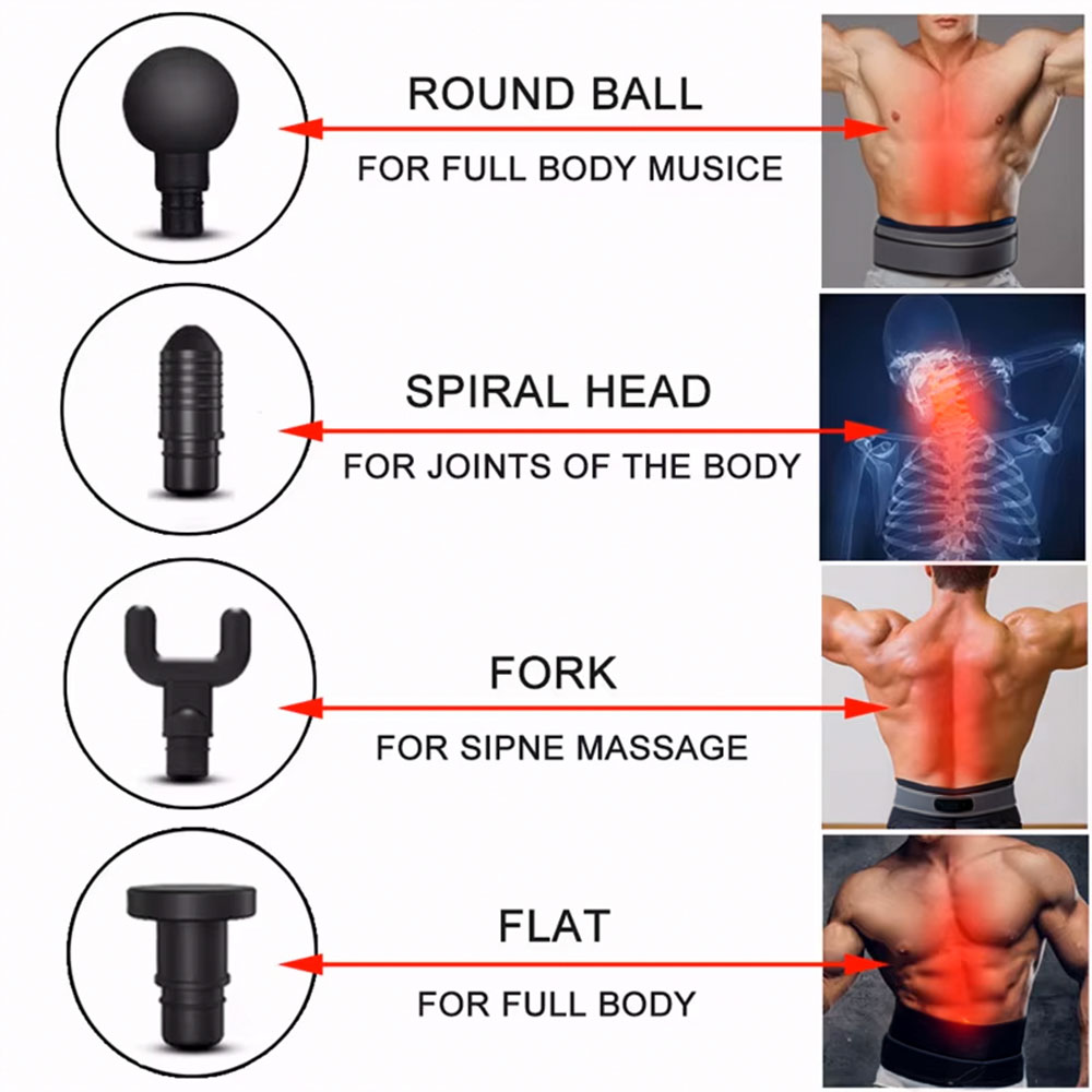 - 4 Têtes de massage interchangeables: Livré avec plusieurs embouts pour cibler différents groupes musculaires et besoins spécifiques.